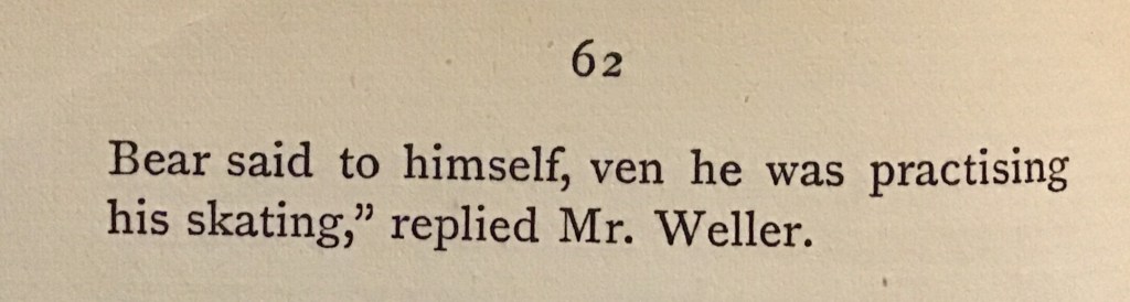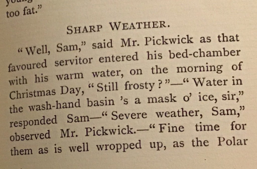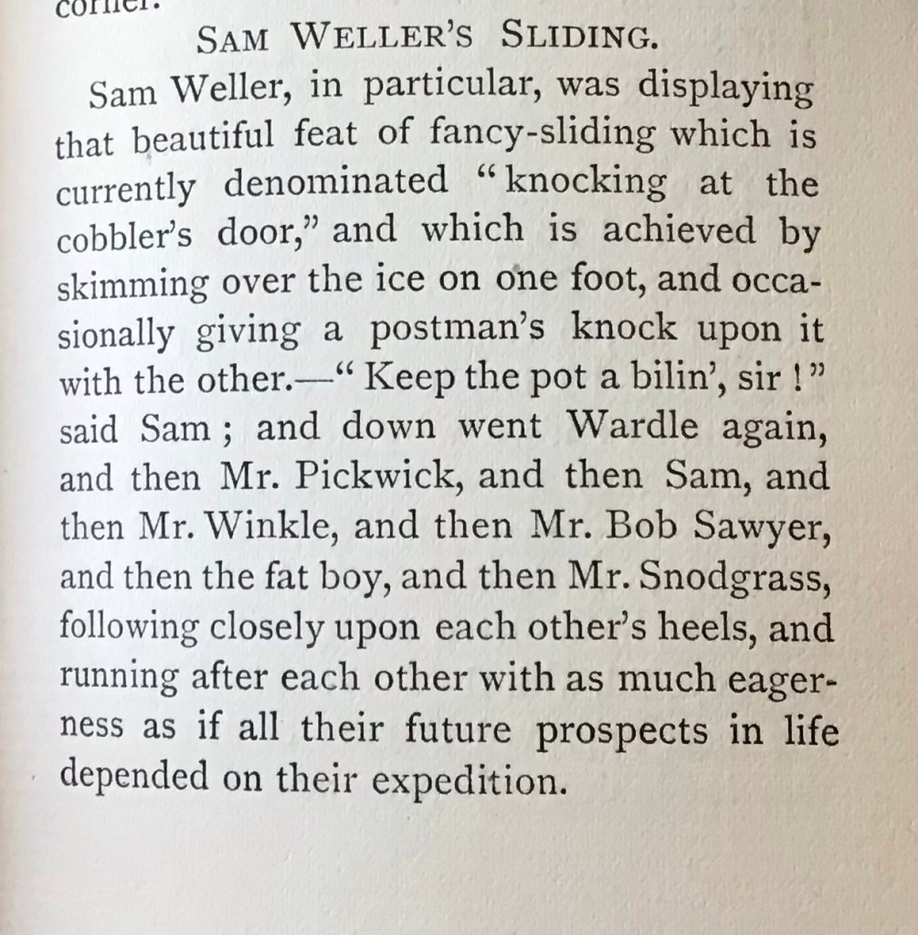 No small part of the success of ‘The Pickwick Papers’ published in 1837 was the inspired creation by Dickens of Samuel Weller, Pickwick’s servant and right-hand man and the creation of his father, coachman Toby Weller. It’s hard not to love this little picture of a group of respectable gentlemen inspired by Sam enjoying the ice on a freezing day.