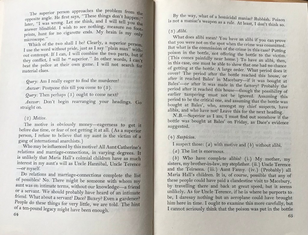 Part of the charm of this tightly structured crime novel – my 1949 edition is only 167 pages – is the personality of Malcolm Warren. Summoned unexpectedly down to visit his aunt for the weekend to advise her on her investments, his first interview with her ends with her sudden death caused by a tonic he has administered. As he moves from observer to suspect a tight web of movement within the household is gradually unpicked.