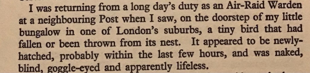The book bundles together the story of the relationship between the two, the cataclysm of their experience of the Blitz and as the post war period begins and the sparrow grows older and is living to an age beyond what could be expected for a sparrow in the wild, a Tory of scientific interest begins to emerge.